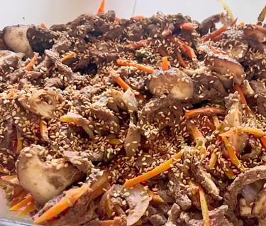6. When it is done, add a tablespoon of sesame oil and stir again well. Garnish the beef with toasted sesame seeds and chopped green onion.