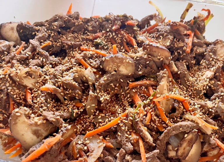 Bulgogi is one of my favourite Korean dishes. The challenge was to make it a little sweet like it has to be but without using added sugar. The answer is Korean pear! Blend it with some more staple ingredients to make a delicious marinade, add some veggies and here you have your healthy and nutritious meal. It can even be eaten on its own for a low carb option! Otherwise serve with rice or cauliflower rice, or in salads or wraps.